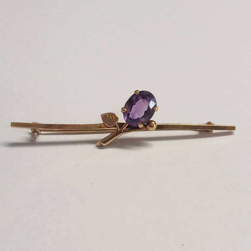 9ct gold amethyst set floral bar brooch - 5.5cm long, 2.8g