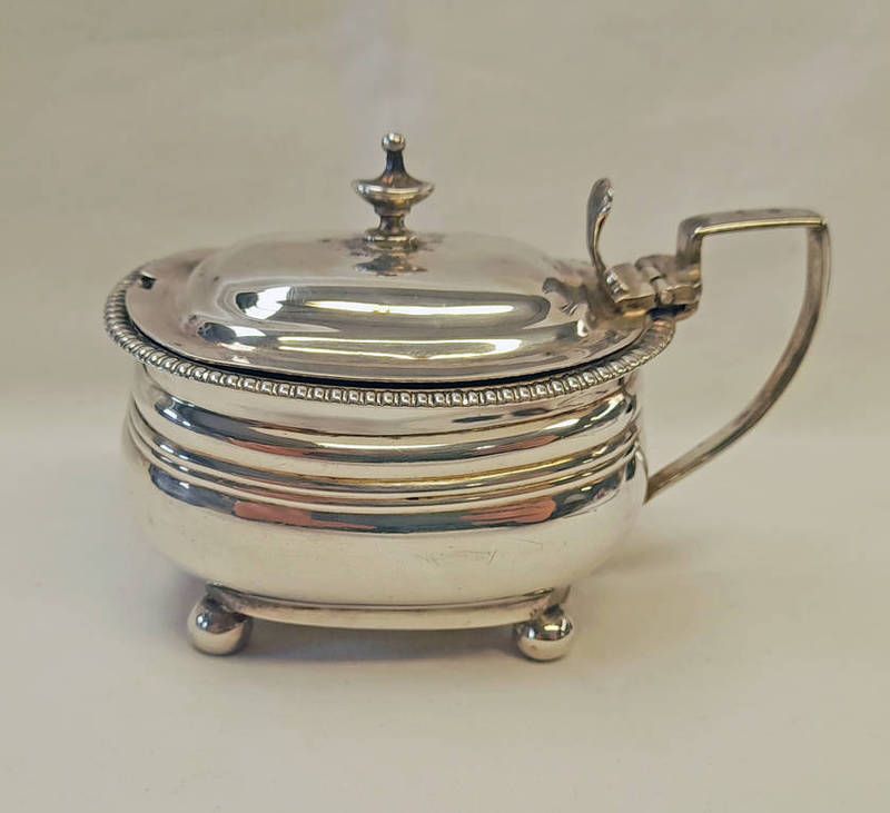 Silver oval mustard pot, silver circular mustard with blue glass liner & silver pepper -...