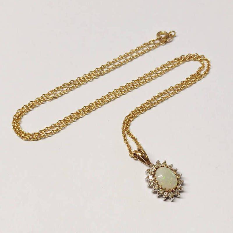 9ct gold opal & diamond cluster pendant on 9ct gold chain, the diamonds approx 0.8 carats in total - 5.1 g total