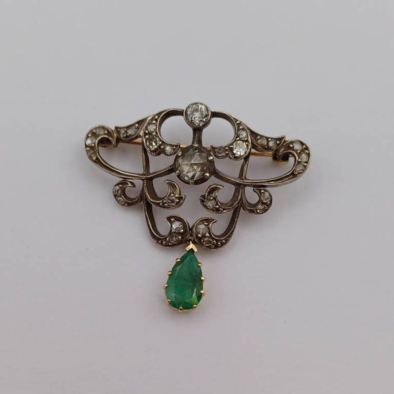 19th century gold emerald & diamond set brooch, in a scroll setting with circular cut & rose-cut diamonds , & a pear shaped emerald suspended below, the principal diamond very approx 0.58 carats - 4 cm wide