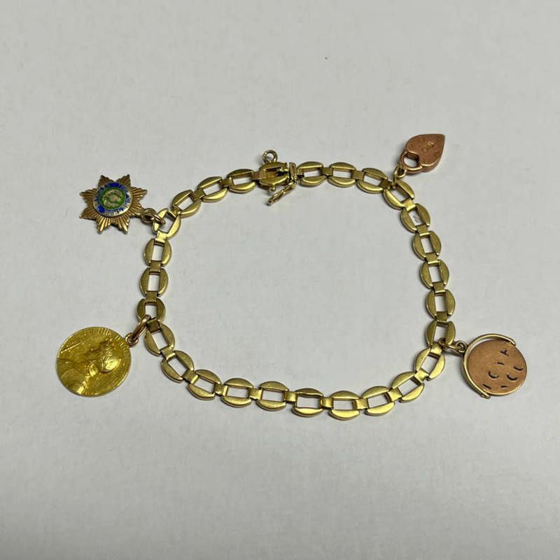 18ct gold bracelet with various gold charms including french 18ct gold joan of arc medallion - 19cm long, 18.4 g