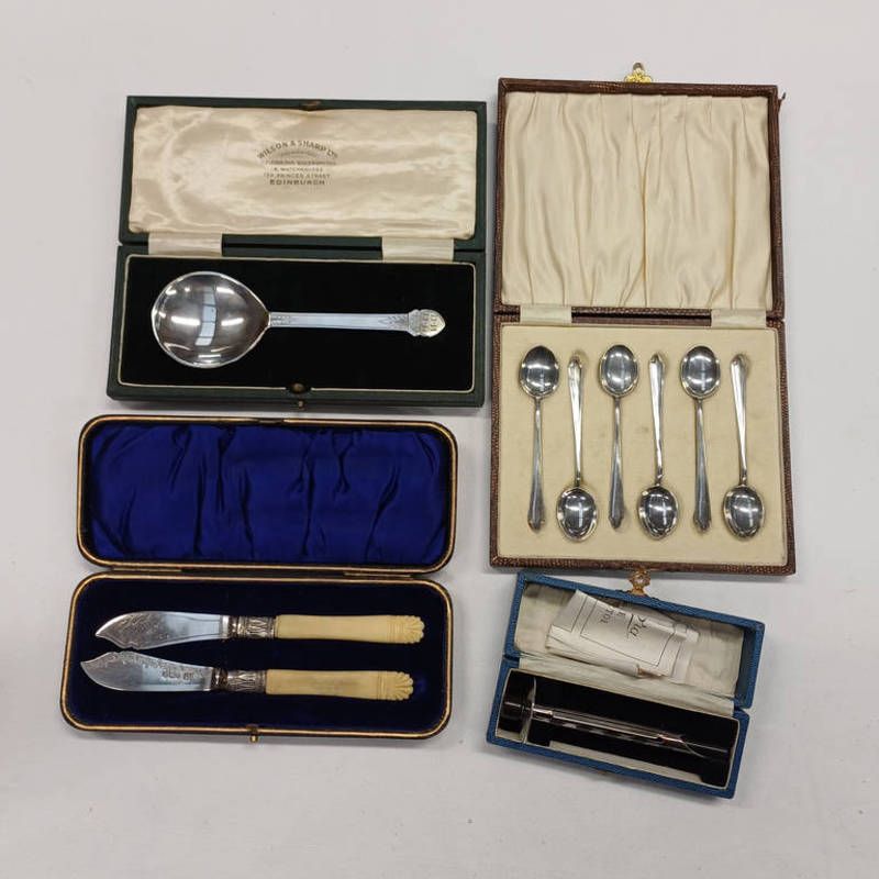 A cased scottish silver spoon by wilson & sharp, edinburgh 1926, a cased set of set silver teaspoons by hukin & heath ltd, birmingham 1923, a cased pair of silver fish knives & a cased silver lemora juice extractor
