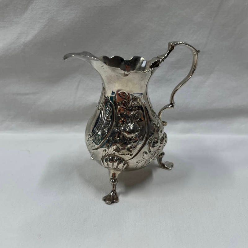 George ii silver cream jug with embossed decoration by david mowden, london 1753 - 85g, 9.5cm tall