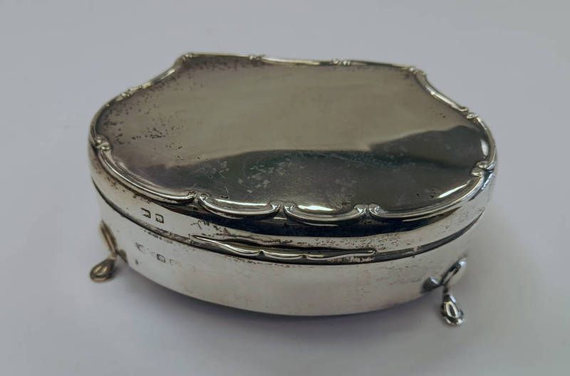 Silver jewellery box with bow front on 4 shaped supports, london 1913 - 10cm wide