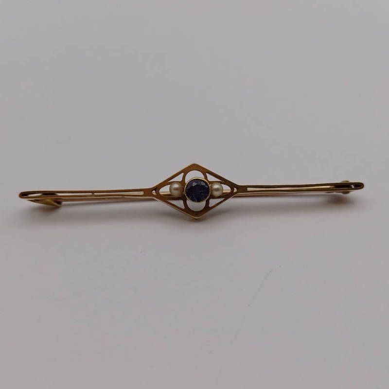 Early 20th century 15ct gold pearl & sapphire set brooch - 2.5g, 5.5 cm long