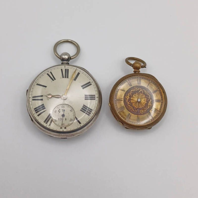A victorian silver pocket watch, chester 1877 (back of case missing) (as found) & a gilt metal pocket watch