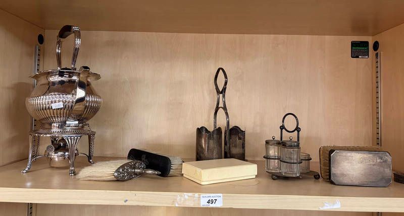 Pair of silver backed brushes, silver plated spirit kettle, etc on 1 shelf