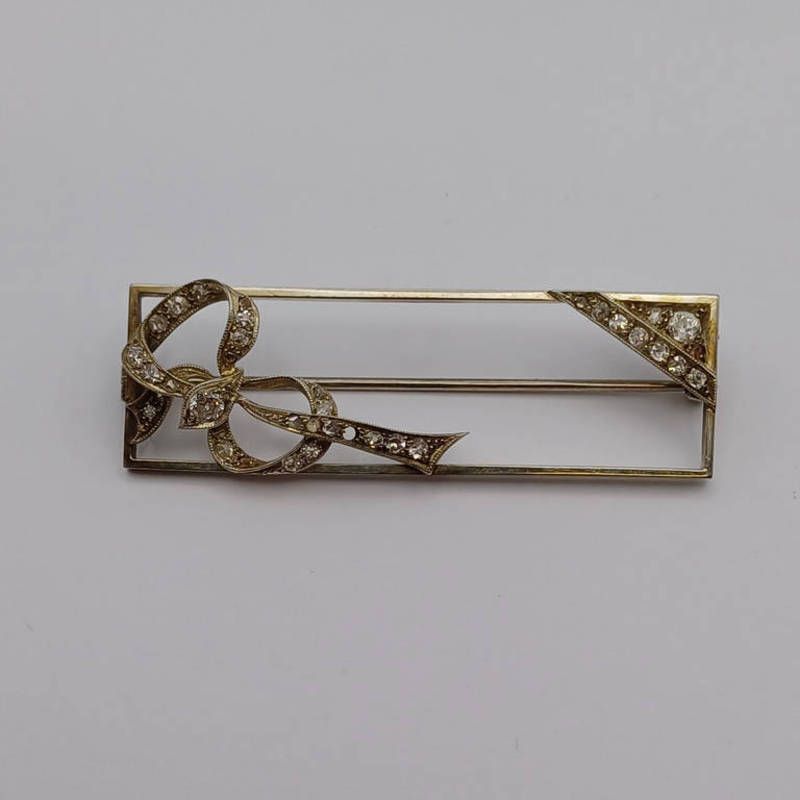 Early 20th century art deco gold & diamond brooch, in the form of a ribbon set in a rectangular frame, 5.1cm long, 1 diamond missing