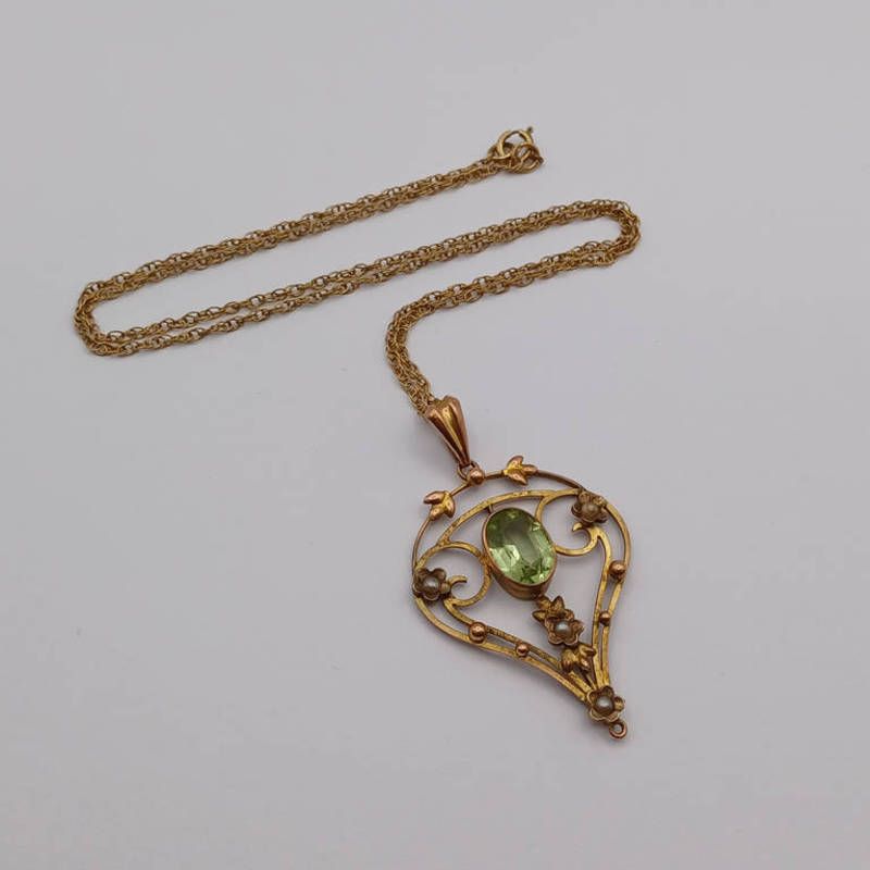 9ct gold seed pearl & peridot pendant on 9ct gold chain - 4.6g