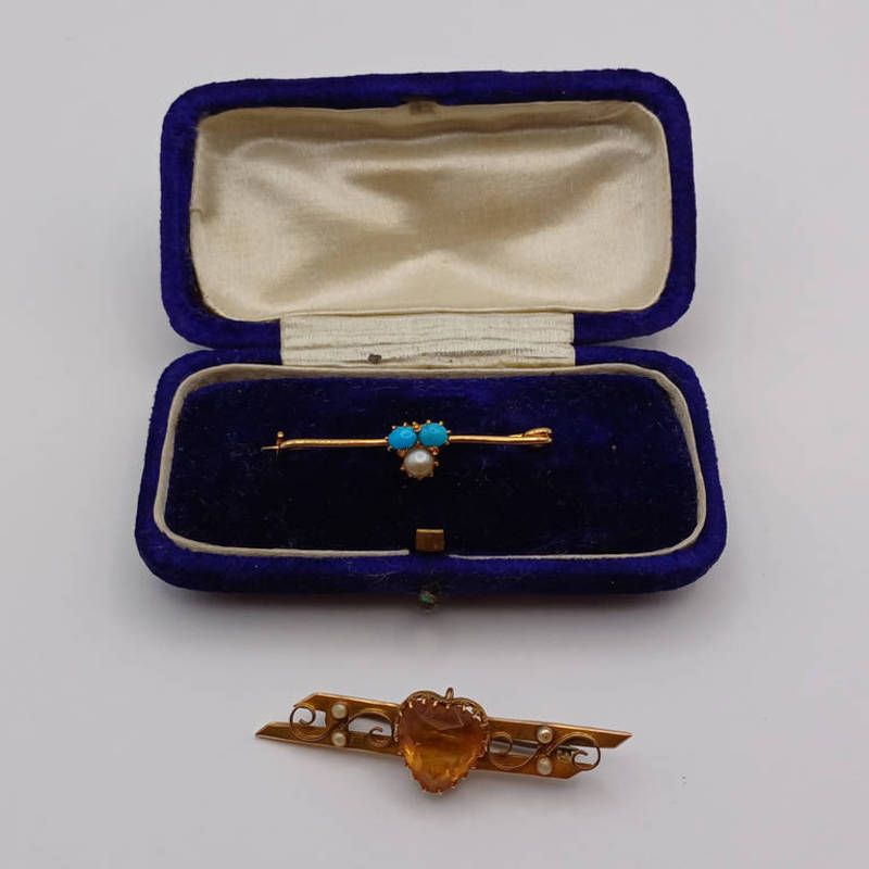 9ct gold seed pearl & citrine brooch, & a gold pearl & turquoise brooch - 4.6g total