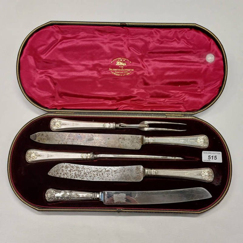 Cased silver handled 4 piece carving set retailed by harrods, sheffield 1913, with an associated silver handled bread knife