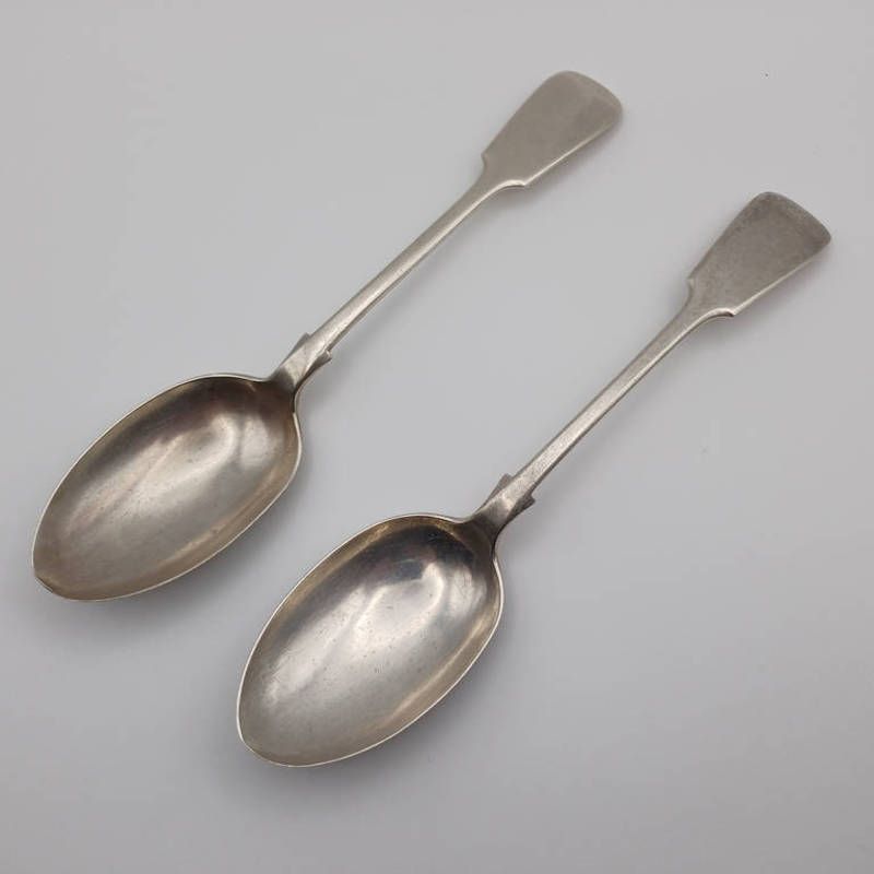 A pair of late victorian silver fiddle pattern dessert spoons by john round & son ltd, sheffield 1900, 142g
