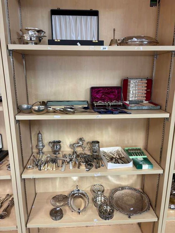Large selection of silver plated ware including cutlery, salver, cased set of knife rests & napkin rings, entree dish, etc on 4 shelves