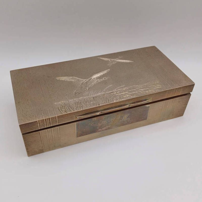 Silver jewellery box with engine turned decoration, the lid engraved with peter scott style scene of ducks by a wilcox, birmingham 1950 - 19.5 cm wide