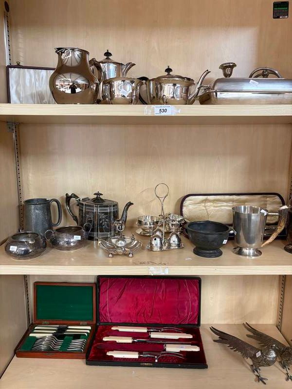 Selection of silver plated ware including case carving set, entree dish, 4 piece teaset, etc on 3 shelves