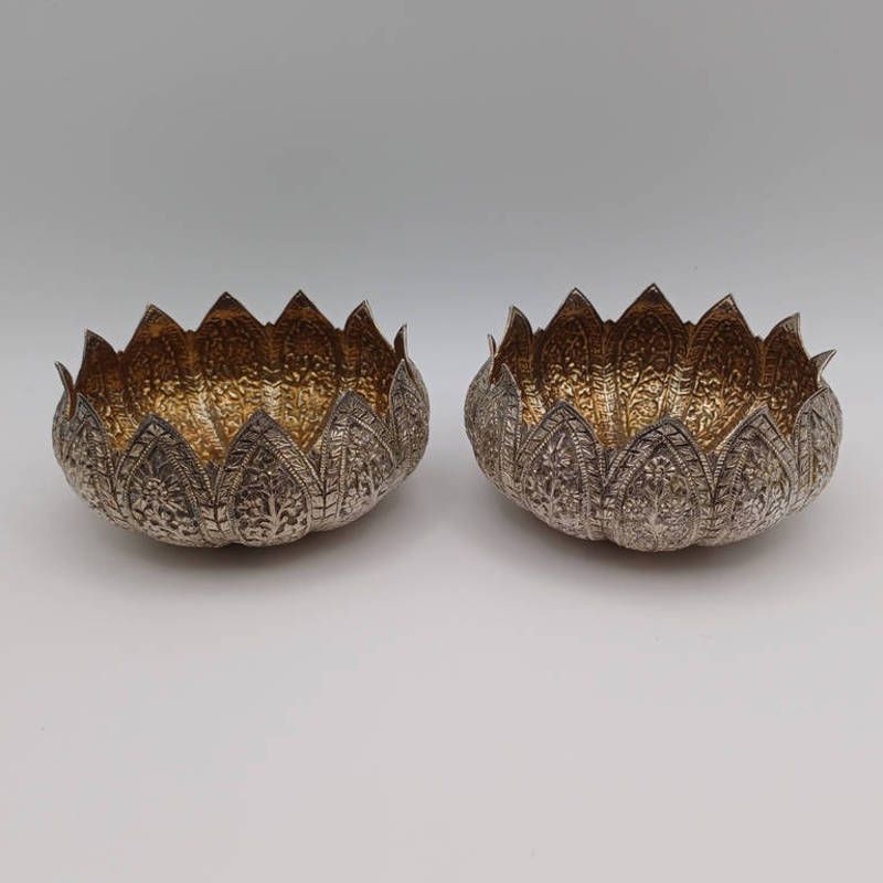 Pair of indian white metal lotus flower bowls with embossed decoration, unmarked - 10 cm wide