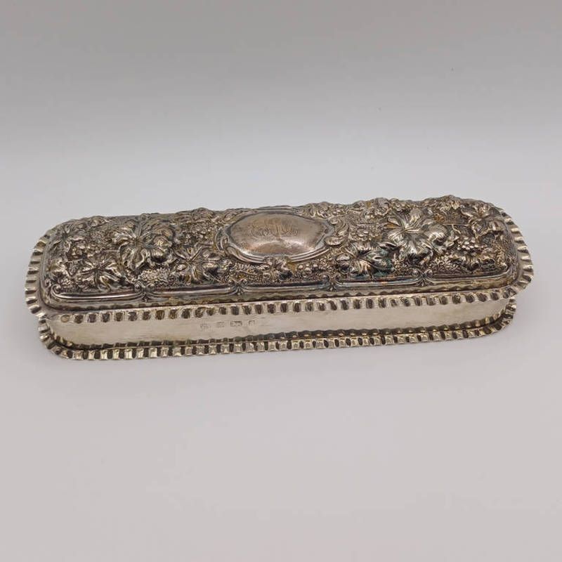 Silver oblong hinged lidded box with embossed decoration, birmingham 1903- 130 g