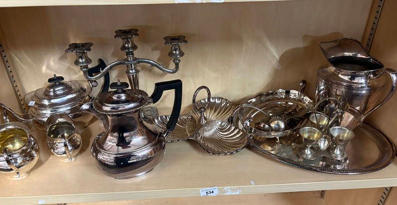 Selection of silver plated ware including 3 piece teaset, candlestick, oval tray, etc on one shelf