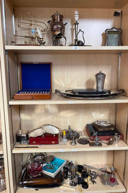 Large selection of silver plated ware etc including pair card trays, mahogany cased set of knives & forks, etc on 4 shelves
