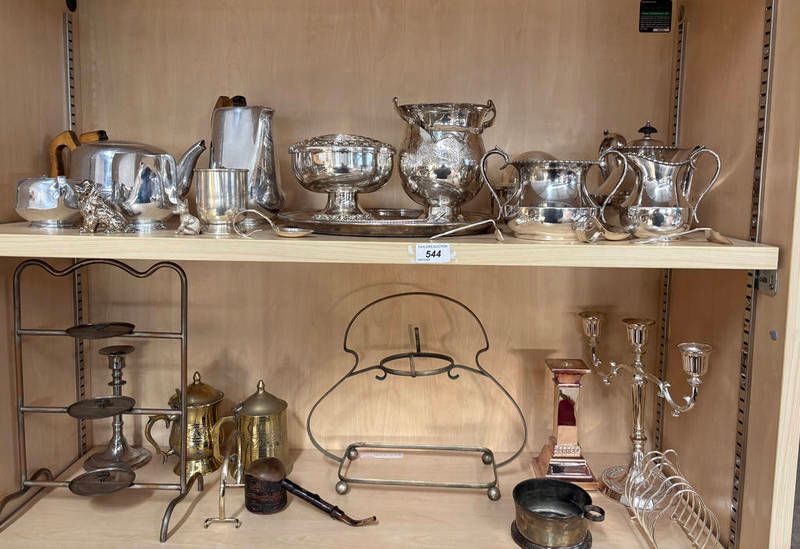Selection of silver plated ware including teaset, 4 piece picquot ware teaset, etc on 2 shelves