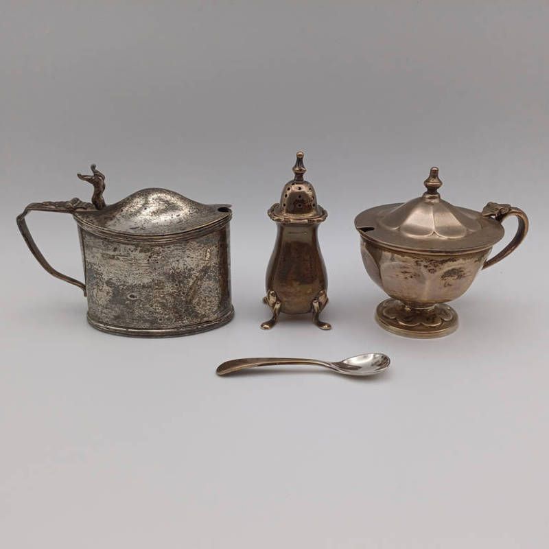 Silver oval mustard pot, silver circular mustard with blue glass liner & silver pepper - 195g weighable