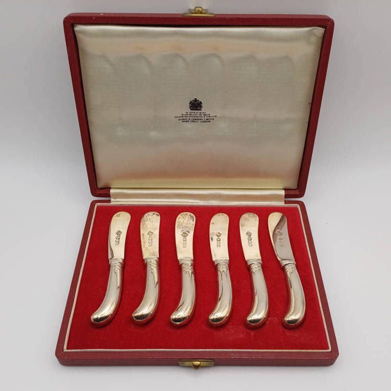 Cased set of 6 silver butter knives by asprey & co. sheffield 1972, 195g