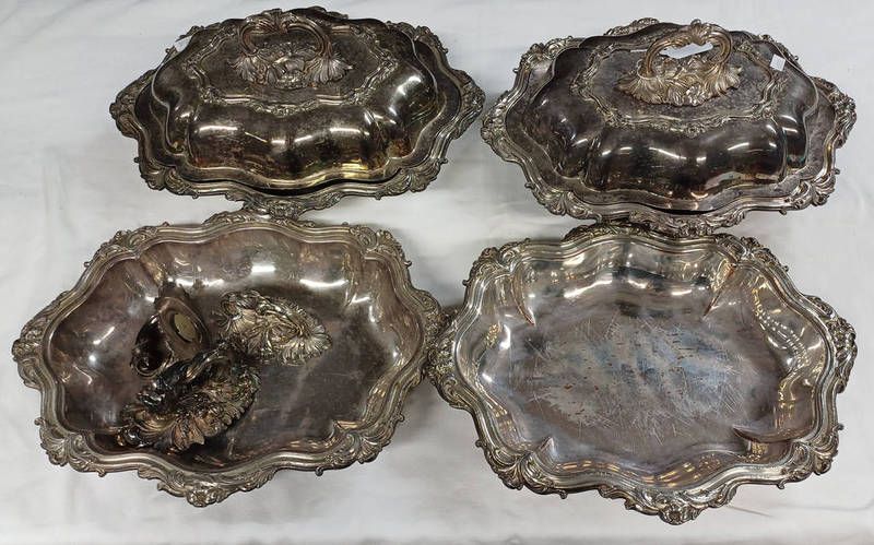 Pair 19th century sheffield plated entree dishes, 2 matching entree dish bases & 2 spare handles