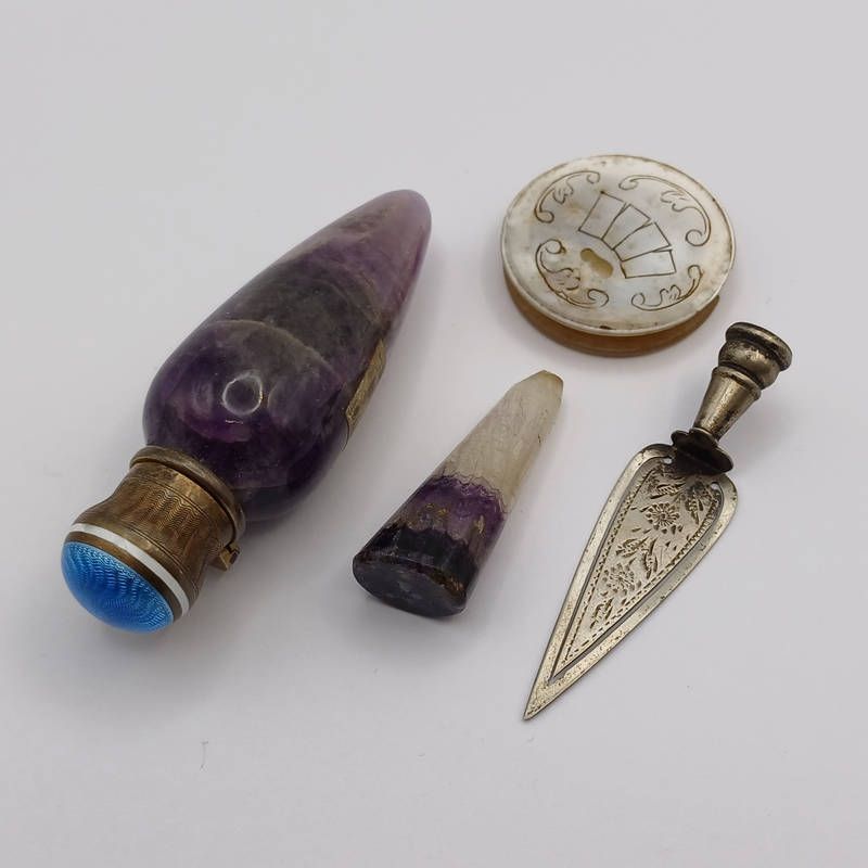 Amethyst scent bottle with blue enamel decorated lid, etc chinese mother of pearl counters, etc.