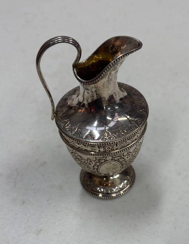 Victorian silver pedestal cream jug with embossed decoration, london 1875, 145g, 14cm tall