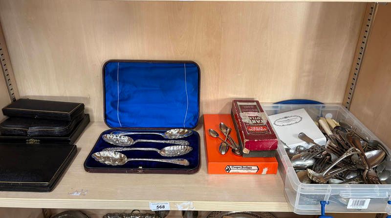 Cased set 6 silver handled tea knives, 2 pairs silver plated berry spoons in a fitted case & various other silver plated cutlery on one shelf