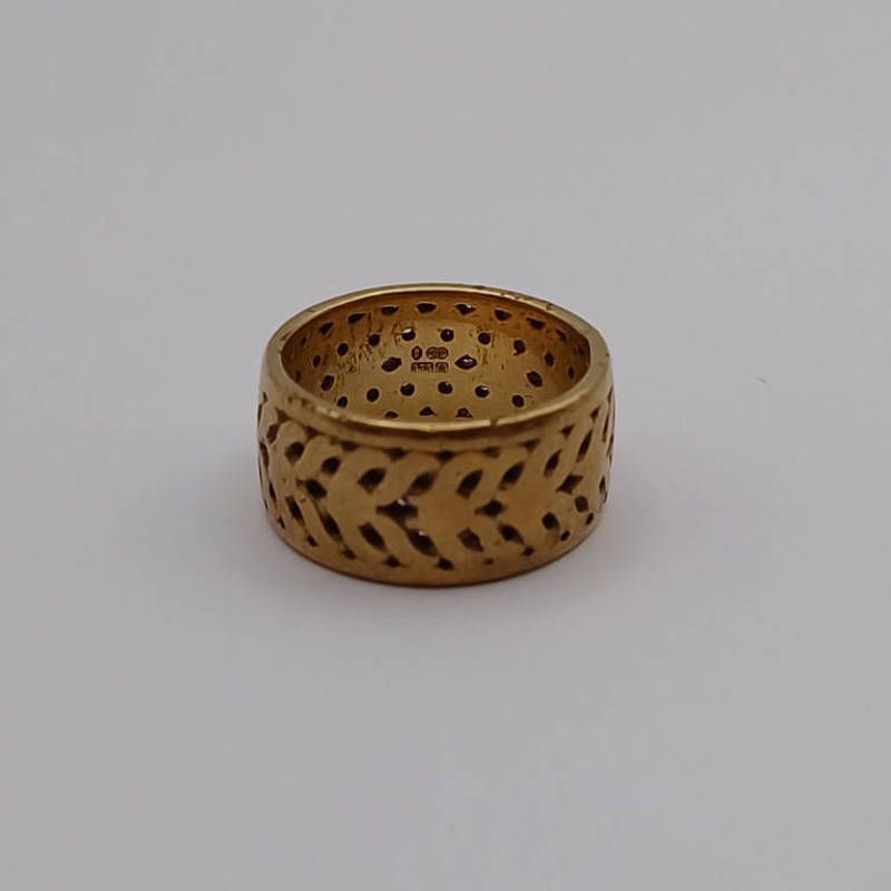 9ct gold wedding band with pierced decoration - 8.2g, ring size m