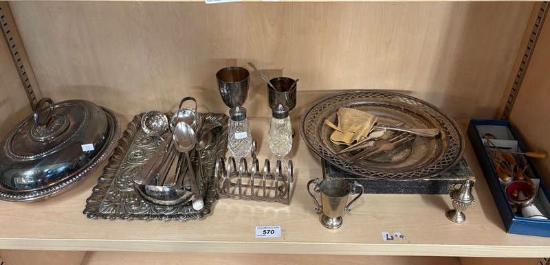 Selection of silver plated ware including entree dish, oblong tray, cutlery, etc on 1 shelf