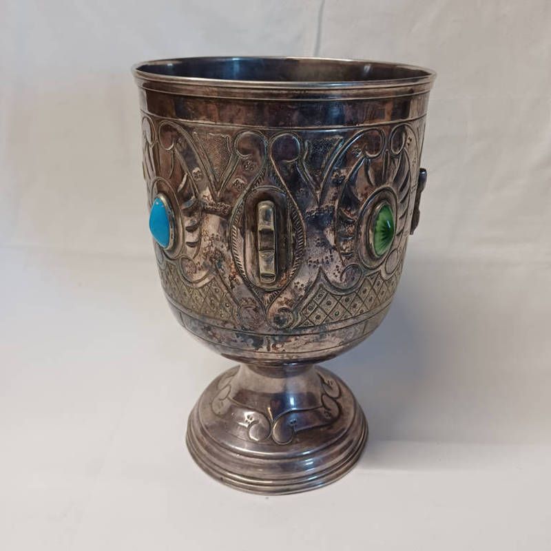 Large white metal goblet style pedestal vase with cabochon stone decoration - 27 cm tall