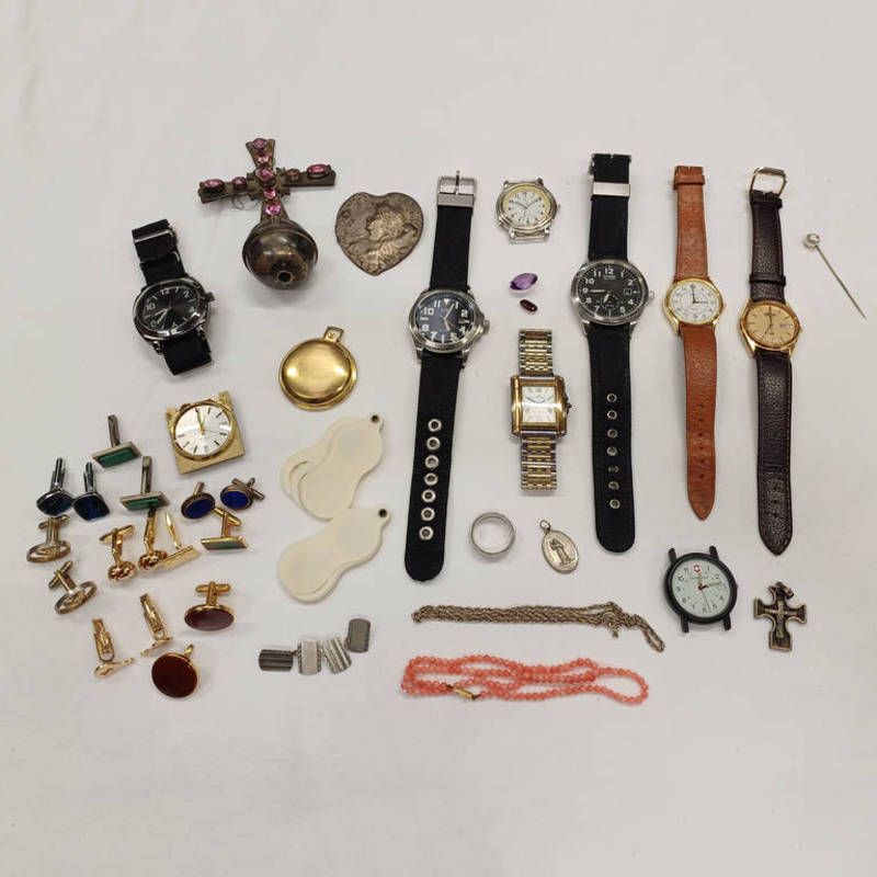 Various wristwatches, rotary pocketwatch, white metal cruciger, silver & other cufflinks, etc