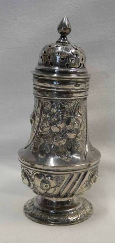 Victorian silver sugar castor with foliate embossed decoration, london 1883 - 12cm tall, 78g