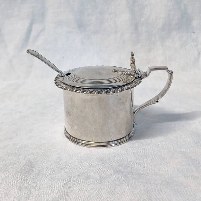 Georgian silver drum mustard pot with gadroon border & blue glass liner by john, henry & charles lias, london 1829 & silver mustard spoon, birmingham 1830 - 125 g weighable silver