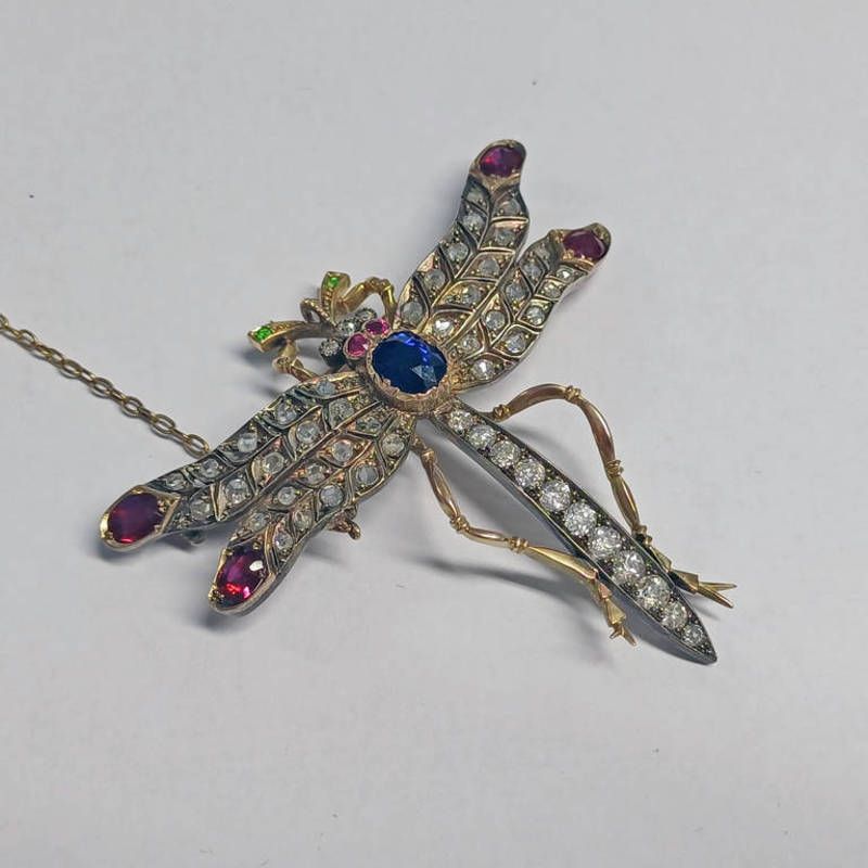 A ruby, sapphire, diamond & garnet set brooch designed as a dragonfly. the body set with an oval cut sapphire, flanked by rose-cut diamond set wings with oval cut ruby terminals, the tail set with old-circular cut diamonds. ruby set eyes to head & green garnet set antenna - the diamonds very approx 2.8 carats in total, 6cm wide, 5.3 cm long, 17.8g, safety chain clasp hallmarked for 9ct gold birmingham 1902