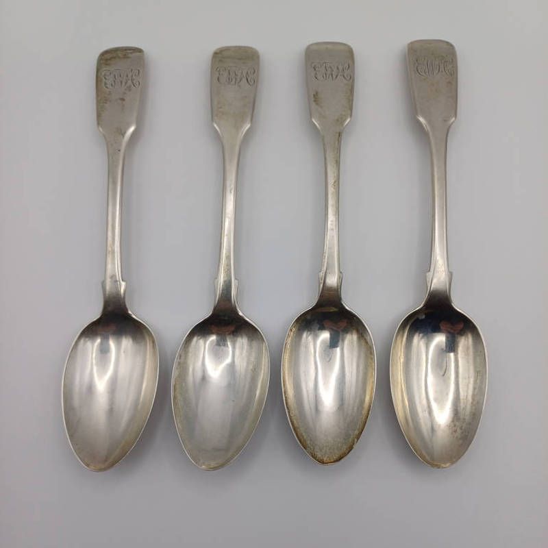 Set of 4 victorian silver fiddle pattern dessert spoons by samuel h haynes, london 18634, 145g