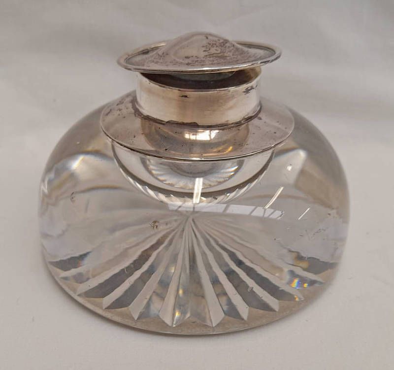 Silver mounted heavy glass inkwell by william comyns, london 1905