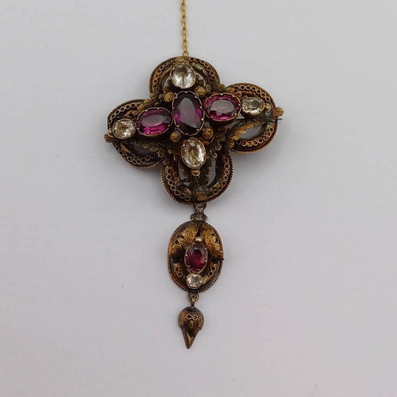 19th century gold garnet & rock crystal brooch pendant, set with oval cut garnets & rock crystals & decorated with fern leaves - 5.5 cm long, 5.5 g