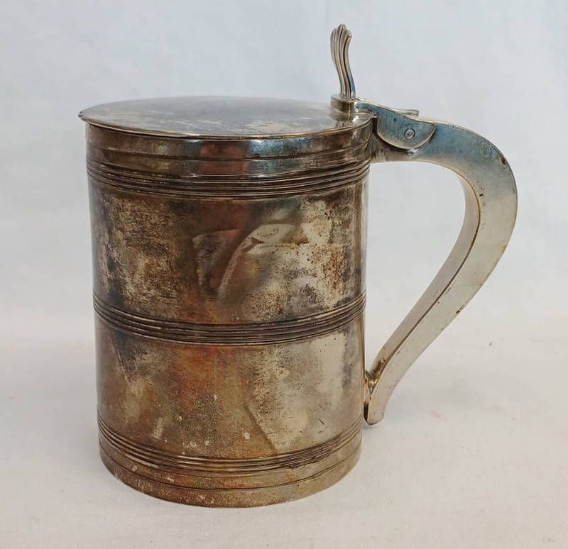 Early 19th century indian silver lidded tankard with ribbed decoration and scroll thumb piece by john hunt & co calcutta - 13 cm tall, 575 g