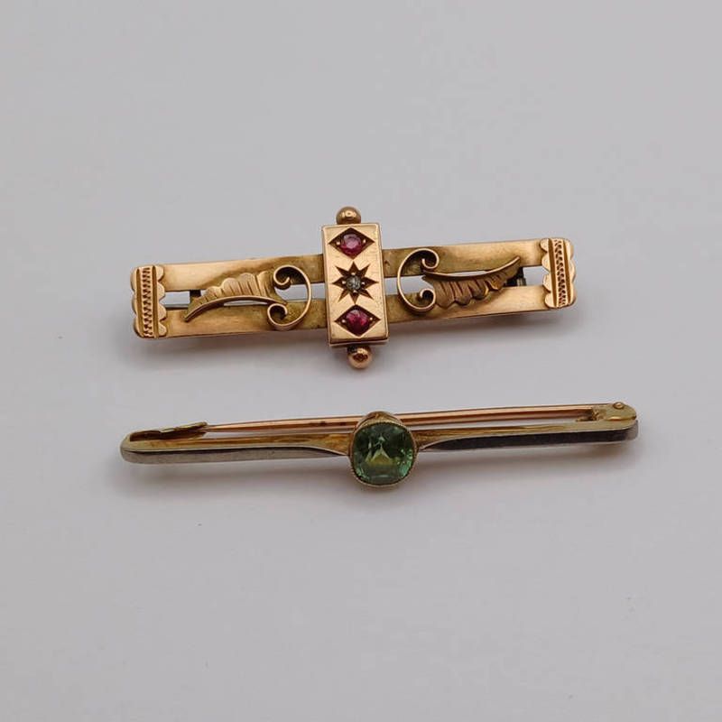 9ct gold ruby & diamond set bar brooch - 3.2g & 15ct gold bar brooch - 3.7 g