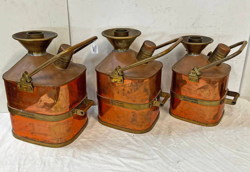 Rare set of 3 bedfordshire city council standard check pump petrol measures, 25 litres, 20 litres & 15 litres, all copper & brass construction with swing handles, 47cm, 46cm and 41cm tall