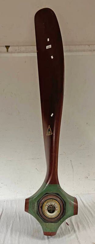 Lang propeller ltd, weybridge, planes propeller with barometer to body, decal to arm, various markings to body, 160cm long nb to be sold plus vat on hammer price