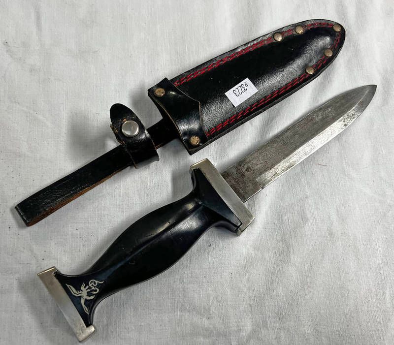 Ww2 style german style boot knife with 13.2cm long blade with makers name to forte, inlaid eagle with snake to grip with its scabbard