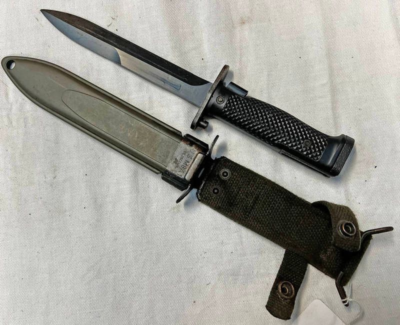 Us m5 a1 bayonet with 17cm long blackened steel blade, cross guard stamped us m5 a1 to top, chequered black grip & a us m8 a1 green plastic scabbard with frog