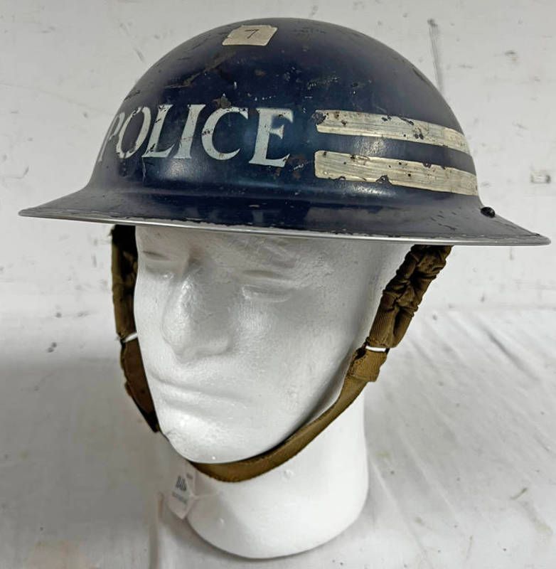 Ww2 british brodie helmet marked police to exterior and stamped marks to body. liner dated 1939 bmb nb to be sold plus vat on the hammer price