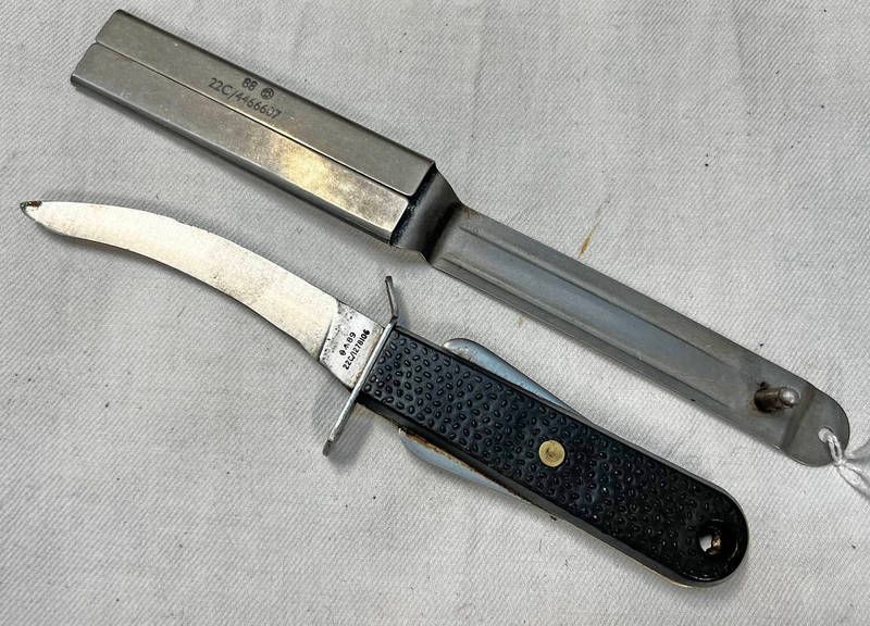 Raf survival suit knife with 10cm long curved blade with markings, characteristic grip & scabbard