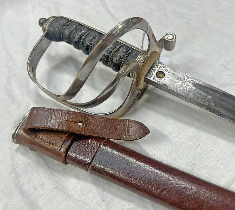 British army officers george v royal artillery sword with 88.5 cm long blade etched with foliage and royal artillery, spine numbered 1820, characteristic bar hilt with bound grip and its scabbard