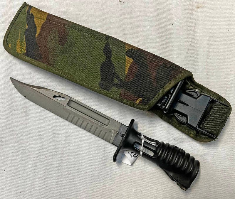 British army l3a1 bayonet with 18cm long clip point blade, characteristic grip with its scabbard